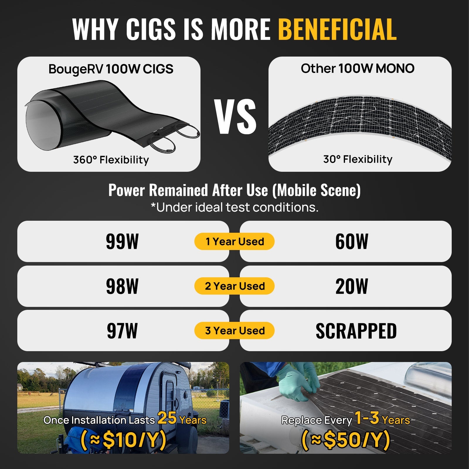 Join the solar revolution with BougeRV's innovative Yuma 100 Watt CIGS Flexible Solar Panel (Rectangle with Adhesive)! Our cutting-edge CIGS solar panels are uniquely designed to flex and adjust to any surface while utilizing CIGS technology to enhance their durability, light sensitivity, and lifespan. Our flexible panels can be easily installed or used as a portable energy solution. Invest in the best and switch to BougeRV CIGS solar panels today!