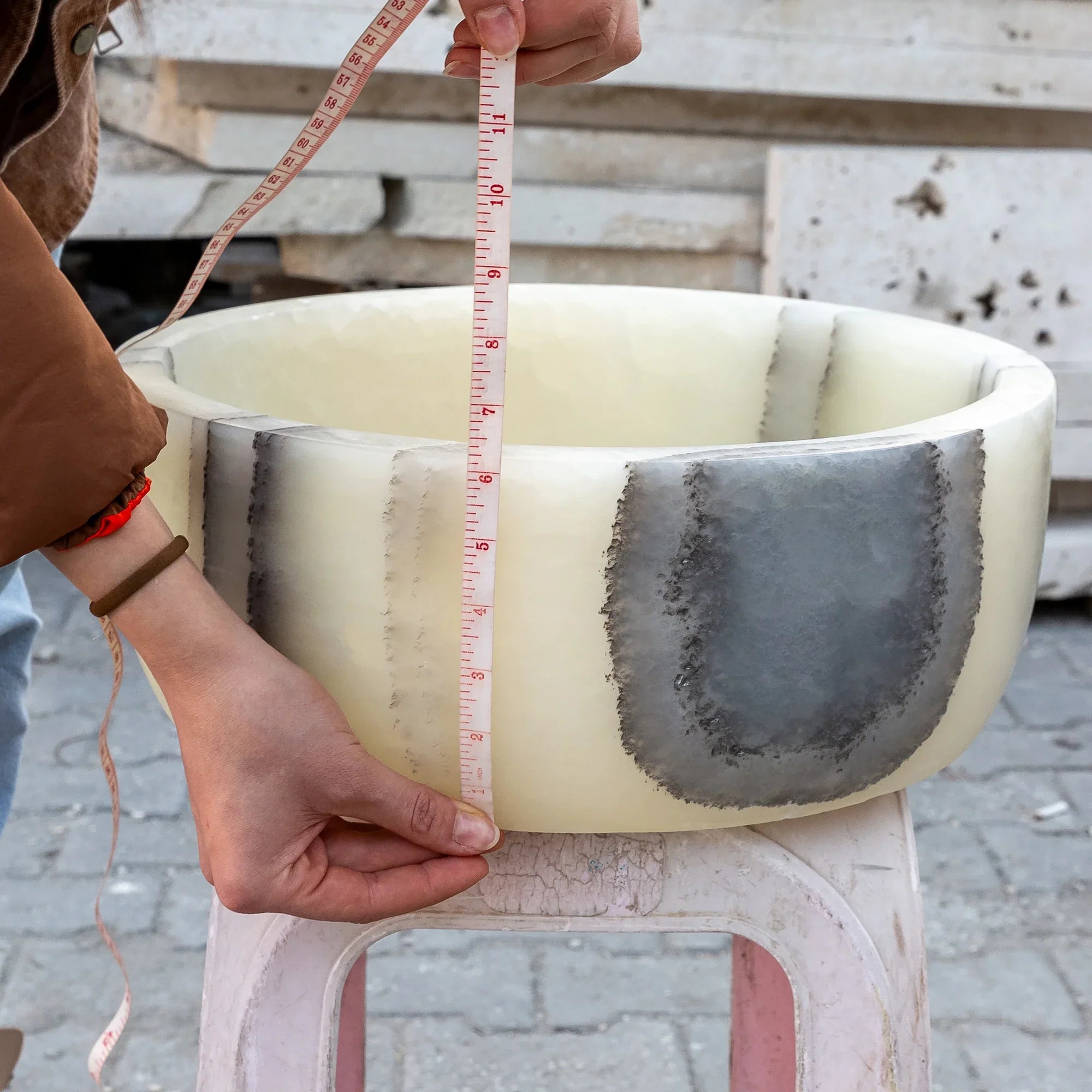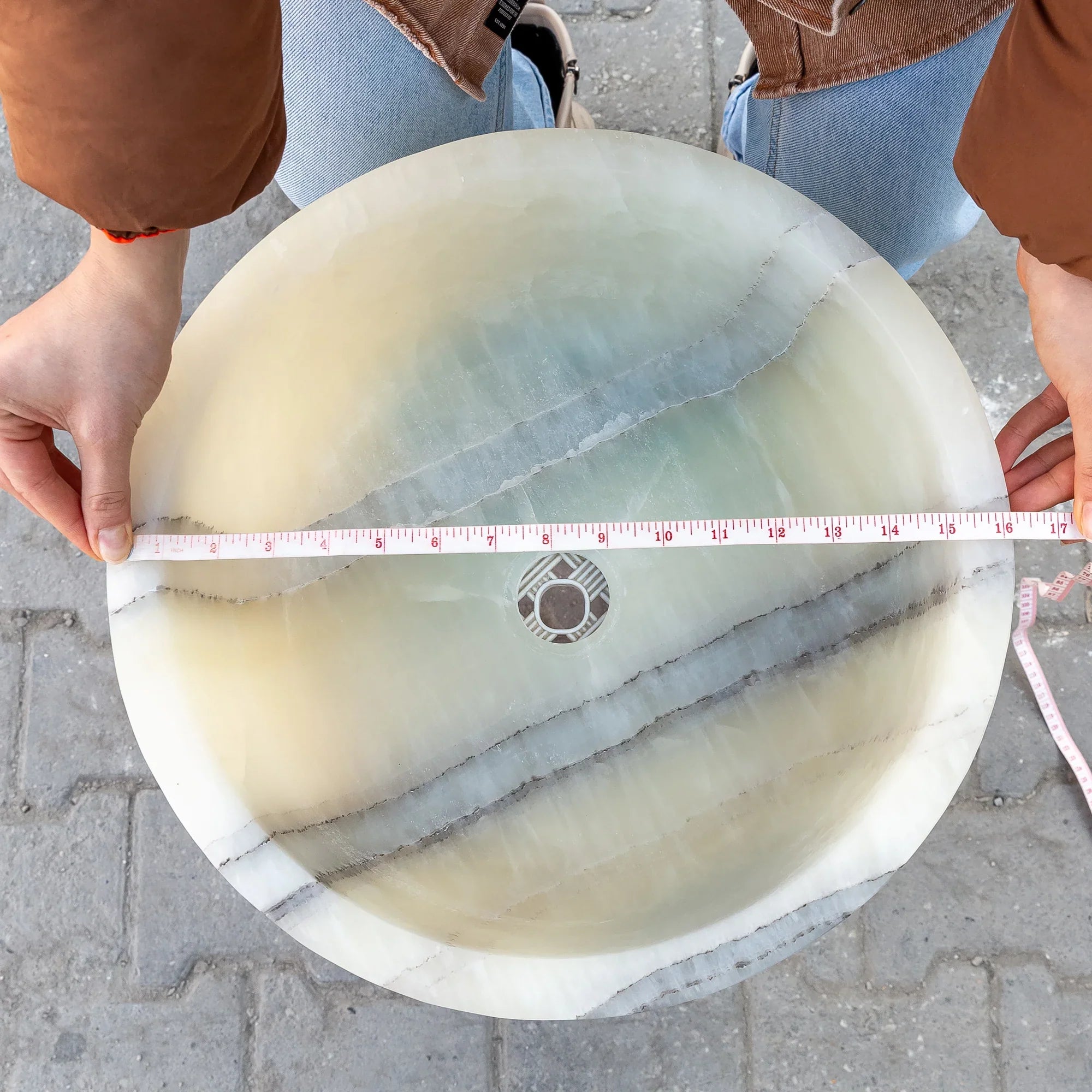 The combination of a smooth, polished interior and exterior ensures this vessel sink will be the focal point of your bathroom decor. The breathtaking onyx from Turkey will blend into any setting. These round vessel sinks for bathrooms are not only convenient for everyday use, but also an ornament for your living space. The artisanal construction ensures that no two sinks will be exactly identical.