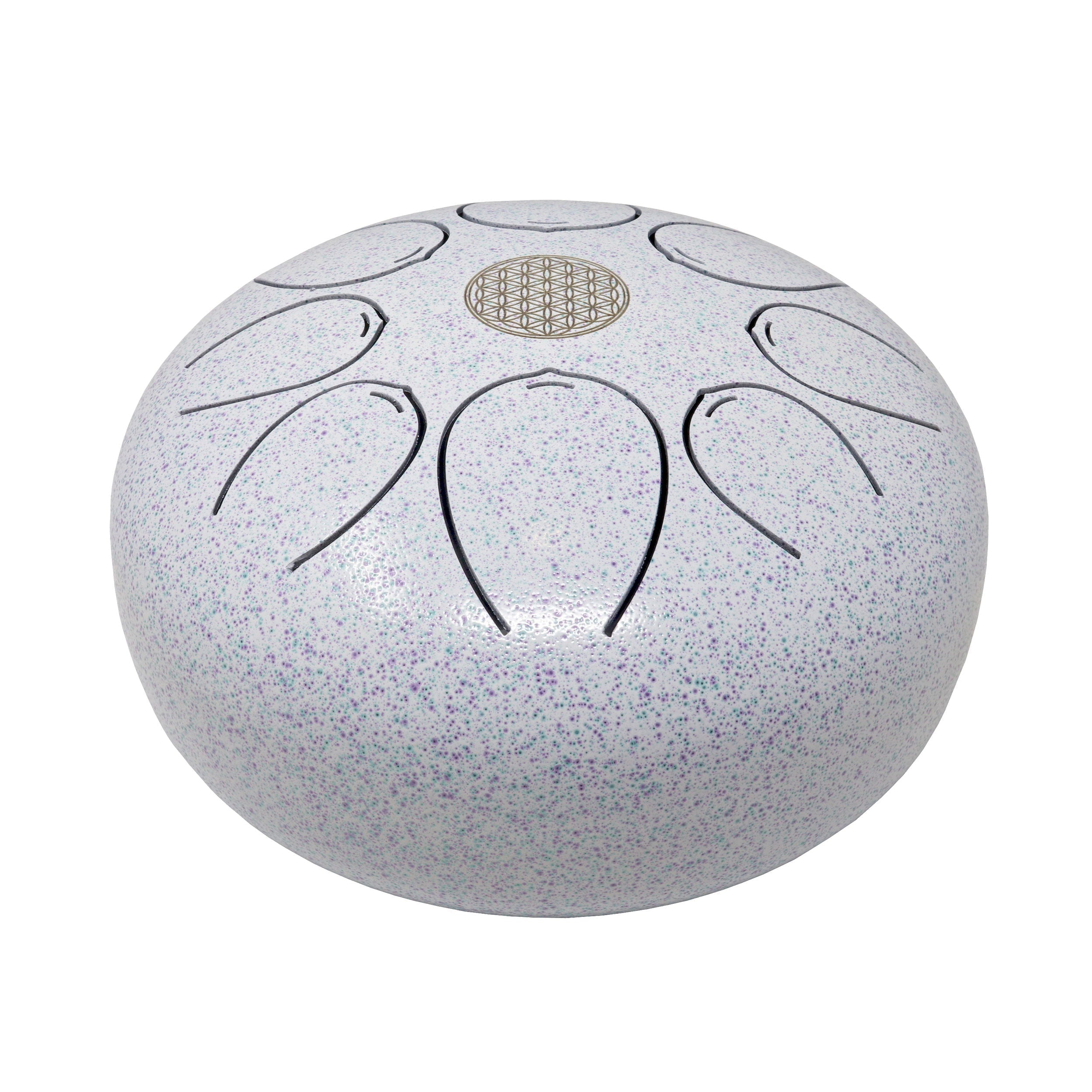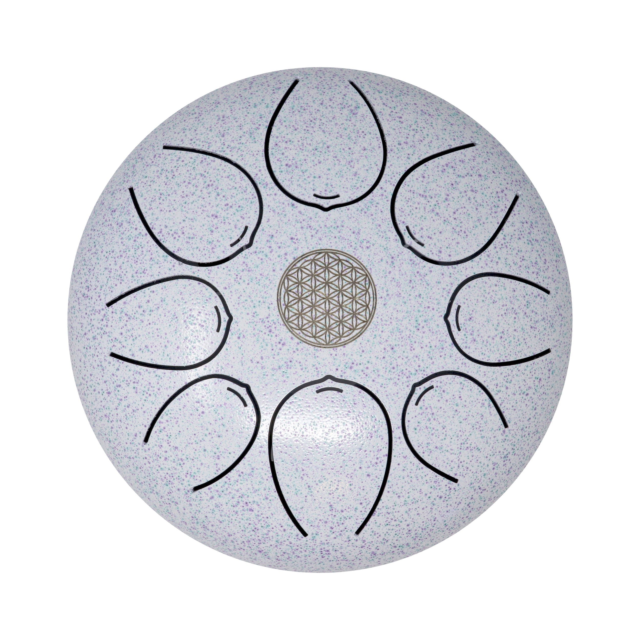 This tongue drum is a versatile and easy-to-play musical instrument perfect for meditation spaces or living rooms. With a metal white shade and a flower of life symbol burnished into the center, it's both subtle and strong in appearance. It comes with a travel bag/backpack, making it easy to transport and enjoy anywhere. You can play it with mallets or your fingers, with no previous musical experience required. The flower of life symbol represents the cycle of creation, making this tongue drum a meaningful addition to any home.