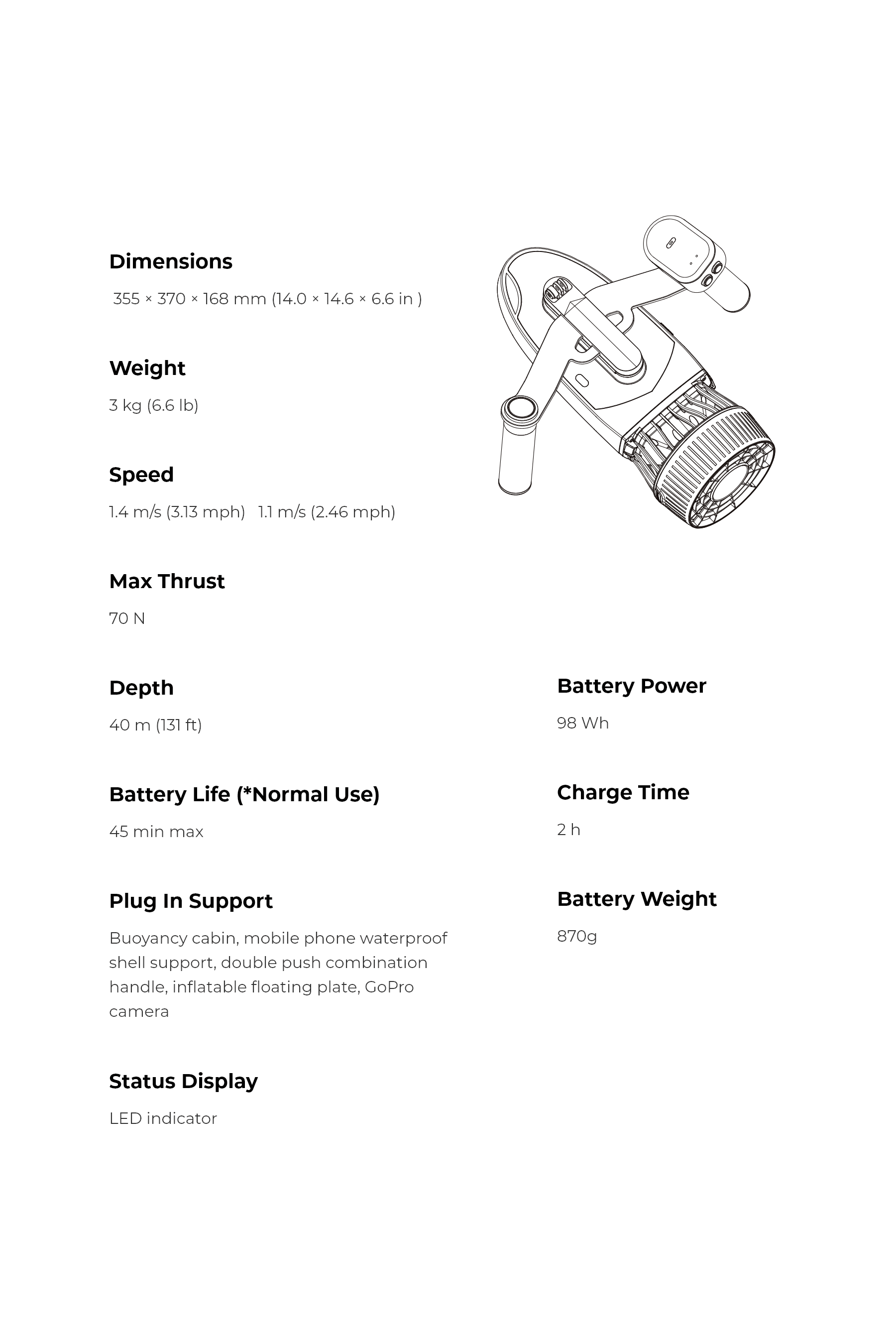 • Max Speed: Up to 2.0m/s (4.5mph) with dual thrusters