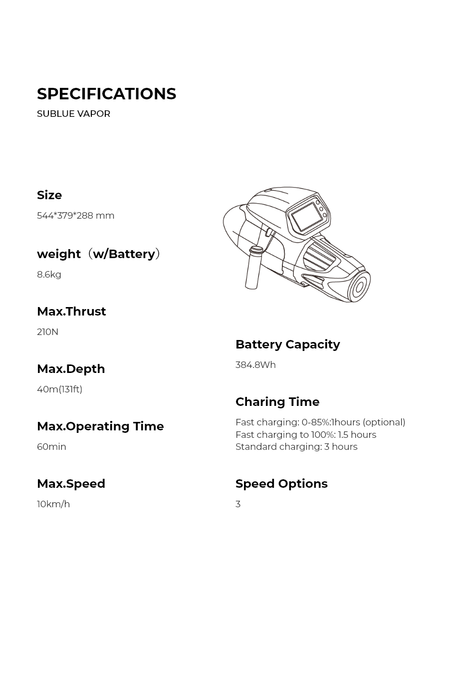 The Sublue Vapor is the perfect balance of power, safety, and portability. With class-leading thrust-to-weight ratio, advanced LCD dive monitoring, and smart depth management features, it’s the professional-grade underwater scooter that empowers exploration like never before.